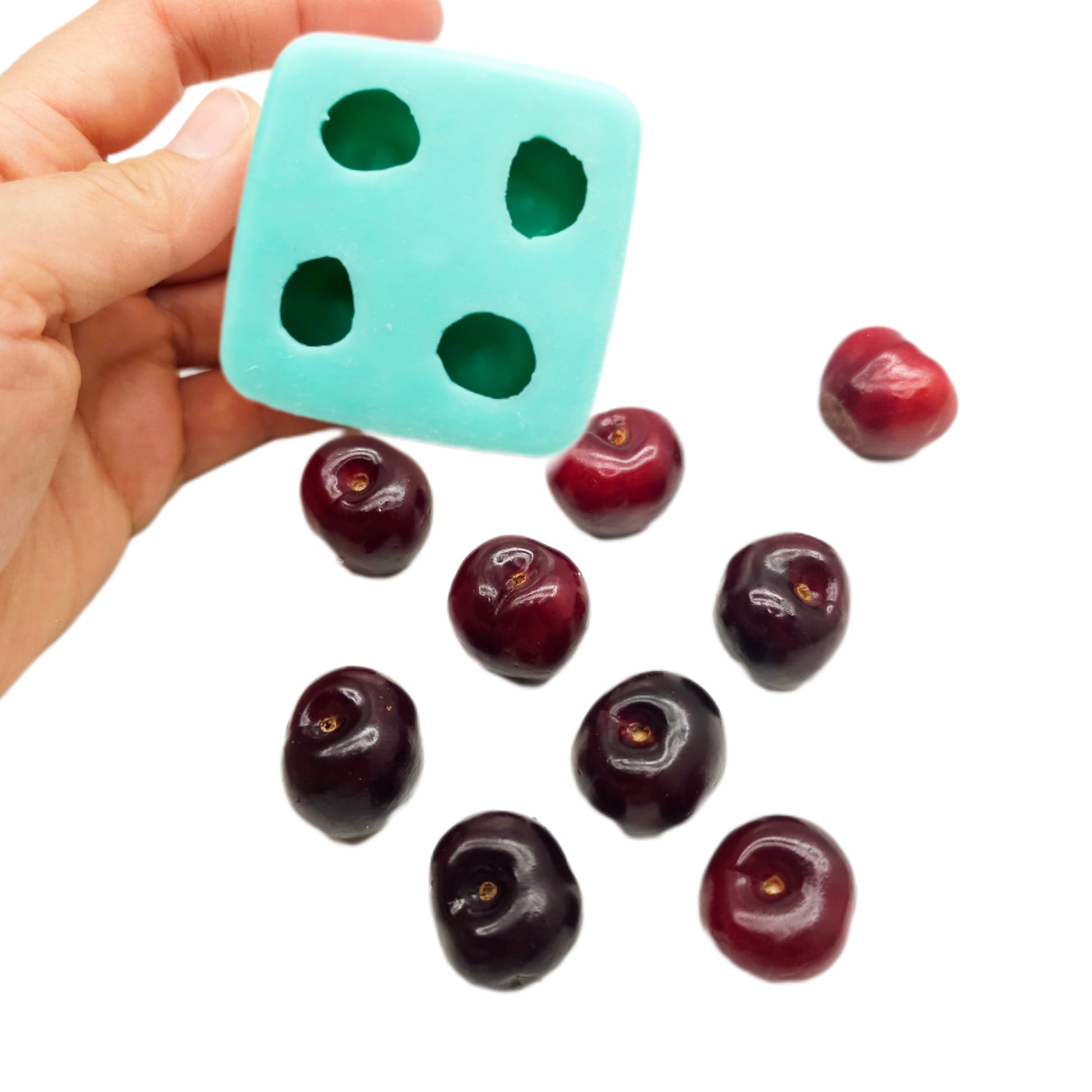 Realistic cherry silicone mold, designed for various craft activities like candle embeds, soap making, resin art, and clay modeling.