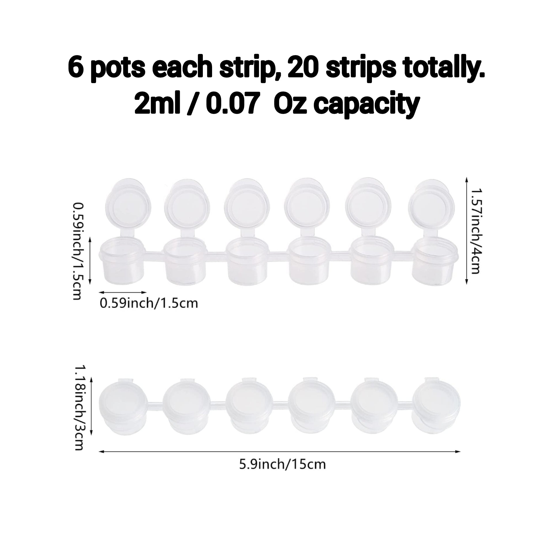 Packaging Details: The paint pot set comes with 20 strips of empty paint pot, 6 pots for each strip, totally 120 pots in 1 package for you, each pot is about 2 ml/ 0.07 ounces in capacity.